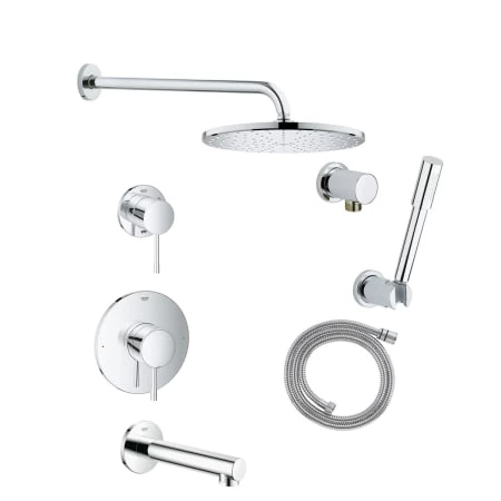 - Shower Package Includes: Shower head, handshower, hose, handshower holder, shower arm, valve trim, diverter, rough-in, tub faucet, and wall supply
