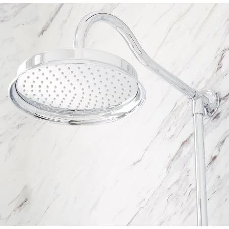 - Showerhead constructed of brass featuring a rainfall spray pattern