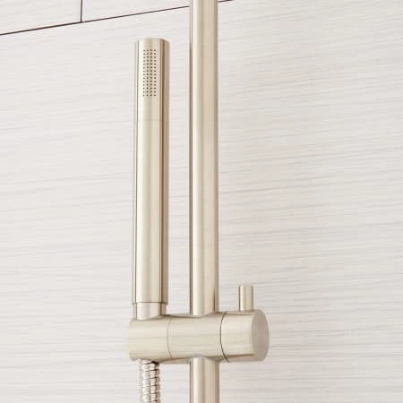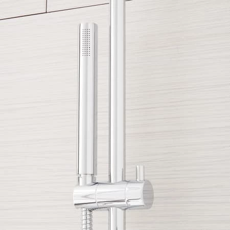 Versatile and sleek, the Exira Thermostatic Shower System offers a rainfall showerhead, a convenient hand shower and six body sprays to pamper you. This solid brass shower system also features a notable thermostatic diverter for consistent temperature.