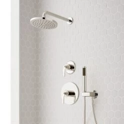 - Shower Package Includes: shower head, hand shower, shower arm, hose, valve trim, wall supply, diverter, handles,