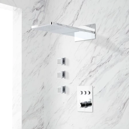 - Shower System Includes: wall mount shower head, three bodysprays, valve trim, and diverter