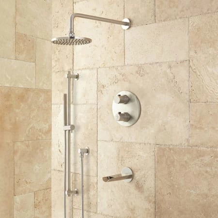 - Shower system includes: wall mount shower head, handles, hand shower, hose, shower arm, slide bar, rough-in, valve trim, wall supply, tub spout