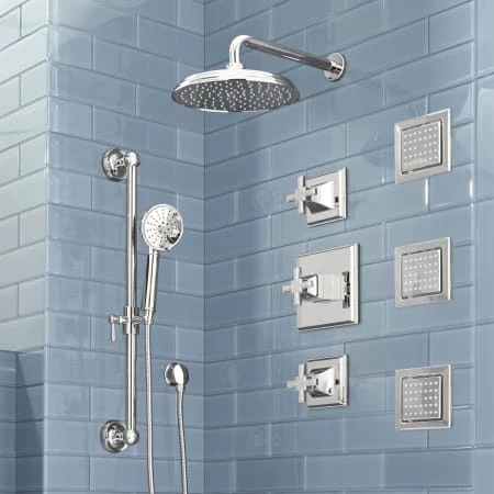 - Shower Package Includes: Shower Head, Hand Shower, Slide Bar, Shower Arm, Hose, Valve Trim, Wall Supply, Body Spray, and Rough-In