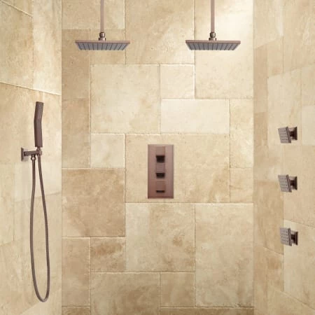 The Ryle Dual Rainfall Shower System brings the luxury of the spa right into your home. Great for a master bath, this set features two ceiling-mount shower heads that send soothing streams of water down to you. To enhance the pampering experience, the Ryle comes with a hand shower and body sprays. All pieces are covered in a premium finish.